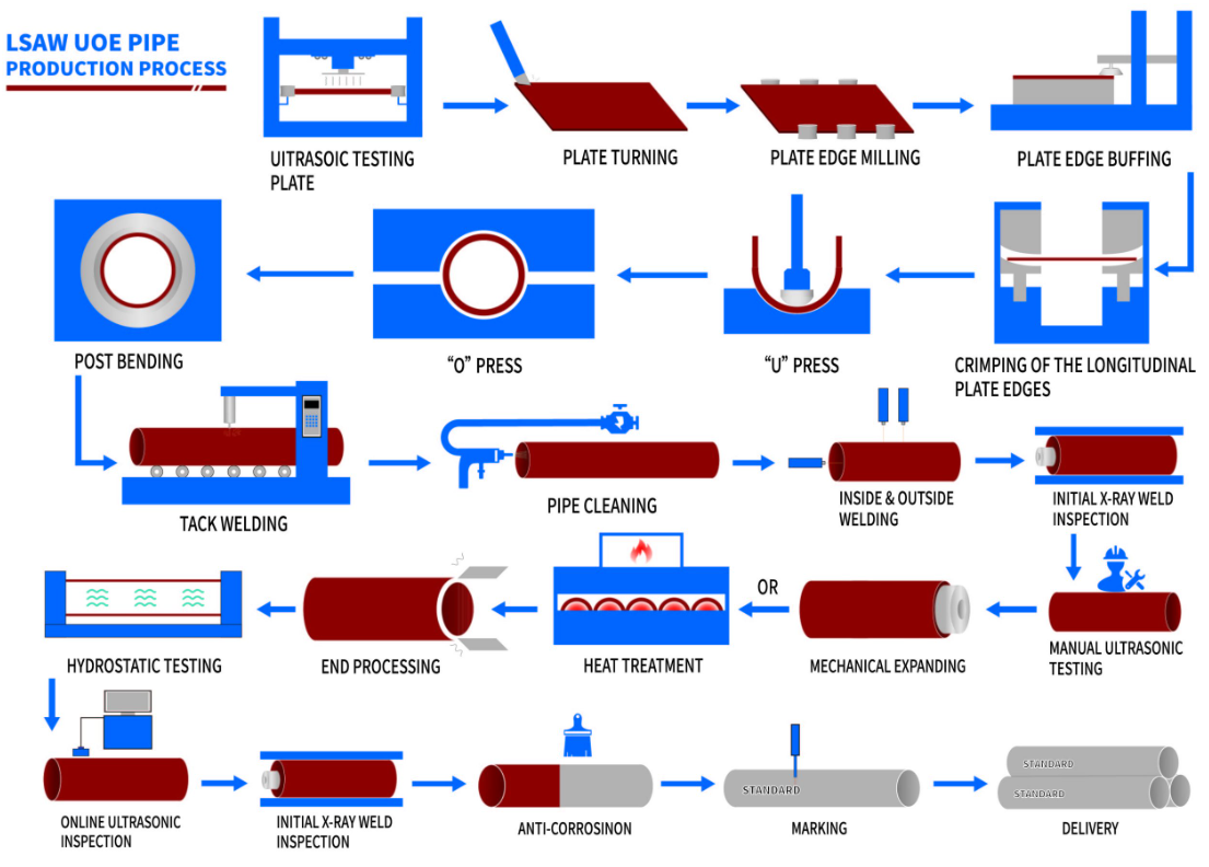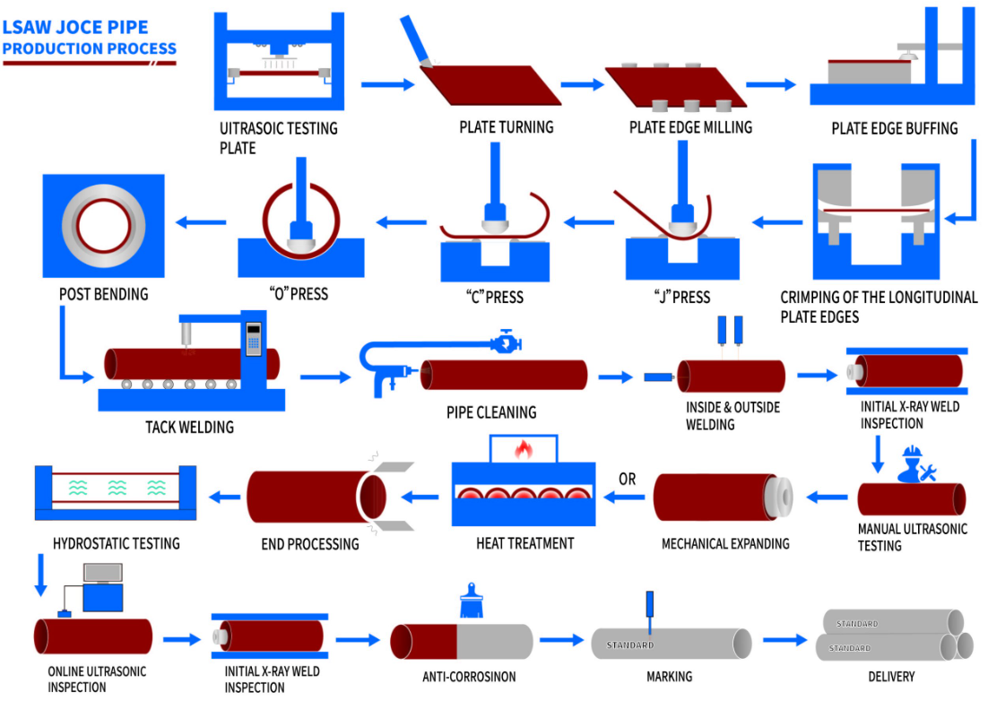 There are two main processes for LSAW pipe production: UOE and JCOE. Both processes utilize pre-welding, submerged arc welding, and expansion, but they differ in their weld preparation and application scenarios.
